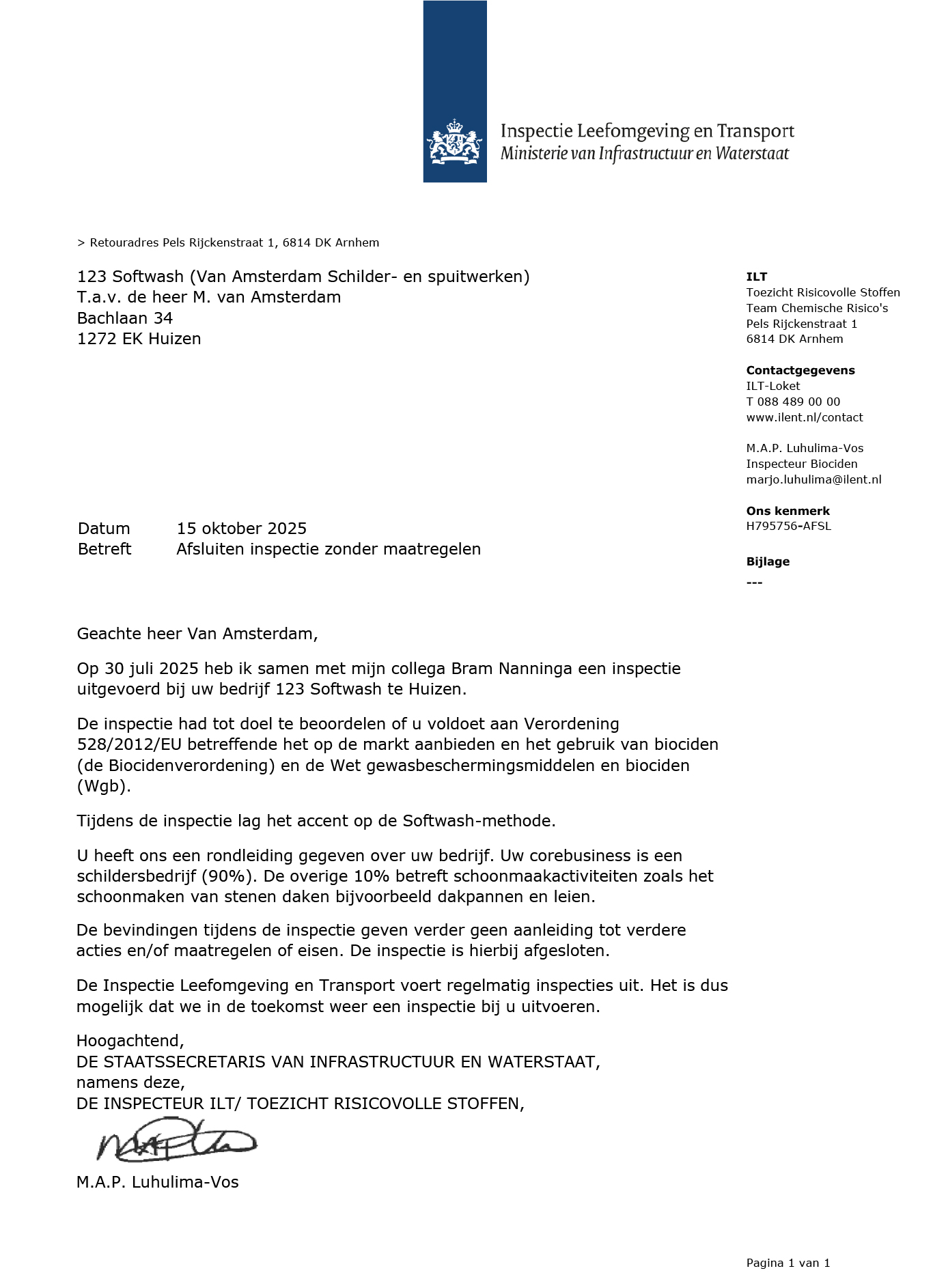 Wij zijn trots om te delen dat 123 Softwash (Van Amsterdam Schilder- en Spuitwerken) op 15 oktober 2025 officieel bericht heeft ontvangen van de Inspectie Leefomgeving en Transport (ILT) dat de uitgevoerde inspectie is afgesloten zonder maatregelen.